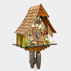 Wer würde nicht gerne vor diesem hübsch gestaltetem Scharzwaldhaus sein Brennholz hacken, umgeben von Tieren und Bäumen. Das Schwarzwaldhaus mit geschindeltem Walmdach ist wunderschön verziert mit Fachwerk, Balkon, Sprossenfenster und einer aus Stein angedeuteter Mauer. Der aus Holz gefertigte Kuckuck ruft zur vollen Stunde die Stundenanzahl (z.B. um 15.00 Uhr 3 Mal) und zur halben Stunde ein Mal, dabei hackt der Mann fleißig das Holz. Dieses Modell verfügt über eine manuelle Nachtabschaltung. Zifferblatt, Ziffern und Zeiger bestehen ebenfalls aus Holz. Das mechanische Rechenschlagwerk läuft 8 Tage. Die Kuckucksuhr wird im Originalkarton mit Gebrauchsanweisung und VDS-Zertifikat ausgeliefert. Diese wunderschön gestalten Kuckucksuhr wird von der Firma Engstler hergestellt, ein seit Generationen geführtes Familienunternehmen, welches für Tradition und Technik steht.