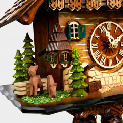 Das Schwarzwaldmädchen mit dem traditionellen "Bollenhut", läutet die Glocke, wenn der Kuckuck zur Tür heraus schaut und die Uhrzeit ruft. Dabei wird sie von den Hofhunden begleitet. Auf der anderen Hausseite, hinter dem Brunnen und einigen Tannen, sieht man Rehe äsen. Das Schwarzwaldhaus ist aufwendig verziert mit einem geschindeltem Walmdach mit Glockenturm sowie mit Rundbogenfenstern mit Herz-Fensterläden, einem goßen Balkon und einem seitlichen Erker. Das Holzgehäuse ist hellbraun gebeizt. Ein Blickfang sind die eingeschnitzten hellen Querstreifen und die aus Naturholz dargestellte Mauer. Der aus Holz gefertigte Kuckuck ruft zur vollen Stunde die Stundenanzahl (z.B. um 15.00 Uhr 3 Mal) und zur halben Stunde ein Mal. Dabei läutet das Schwarzwaldmädchen die Glocke. Diese Uhr verfügt über eine manuelle Schlagabschaltung. Zifferblatt, Ziffern und Zeiger bestehen ebenfalls aus Holz. Das mechanische Rechenschlagwerk läuft 8 Tage. Die Uhr wird im Originalkarton mit Gebrauchsanweisung und VDS-Zertifikat ausgeliefert. Dieses Schwarzwälder Kuckucksuhr  wird von der Firma Engstler hergestellt, ein seit Generationen geführtes Familienunternehmen, welches für Tradition und Technik steht.