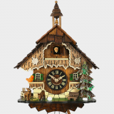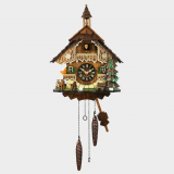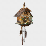 这款拥有钟楼和木瓦屋顶的咕咕钟呈现的是一位游客经过黑森林所见到的农家景色。游人坐在阳台栏杆边观察着松树园中的鹿群。实木房屋由配有布景的格子窗、播种满植物的种植窗台和明亮雕刻的墙壁装饰。整点时,窗门打开,布谷鸟根据具体时间报时且伴有回声。此后,12种不同旋律分别在每小时报时时变换。在咕咕钟的一侧坐落的开关可控制音乐和布谷鸟鸣的开关。通过一枚光传感器,夜晚可实现自动静音功能,而表则不受影响,继续行走。这款拥有石英机芯的迷你咕咕钟配有3枚1.5伏AA电池(美国除外)。这款咕咕钟由位于德国黑森林地区的Engstler公司生产,这一有着历代制造咕咕钟历史的家族企业将传统和技术完美地融合到了所生产的咕咕钟内。