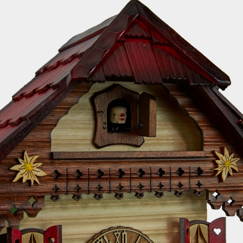 Im Schwarzwald wird auch heute häufig noch mit Holz geheizt. Ein Kachelofen in der Wohnstube sorgt im Winter für eine wohlige Wärme. Dafür hackt Holzhacker Hubert fleissig Holz. Sie können ihm zu jeder vollen und halben Stunde dabei zu sehen. Gleichzeitig ruft der aus Holz gefertigte Kuckuck. Die Original Schwarzwald Kuckucksuhr hat ein Gehäuse aus hellem Lindenholz mit einem rötlichen Dach aus Holzschindeln, die in Handarbeit auf dem Dach angebracht werden. Den filigran gefertigten Balkon ziehren zwei Enziane. Außerdem überzeugt die Uhr durch phantasievolle Details wie z.B. ein Holzstapel, rote Fensterläden, Tannen und größere Steine. Die Kuckucksuhr überzeugt durch die viele Details sowie einen für die original Schwarzwalduhr recht günstigen Preis.