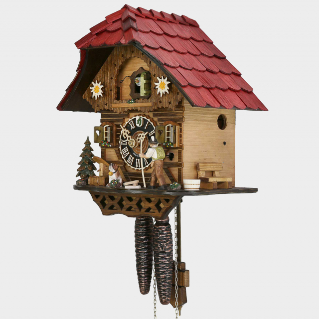 Questo orologio a cucù della Foresta Nera è qualcosa di speciale. Il tetto a quattro spioventi scandolato a mano è decapato in colore rosso. Le Stelle Alpine sotto il tetto e le finestre a traversini con imposte verdi con cuoricino sono un vero colpo d'occhio! L'escursionista passa davanti alla casa, attentamente osservato dal cane da guardia, un enorme San Bernardo con la botte intorno al collo. La fontanella mormora e una panchina invita a fare una piccola sosta. Il cuculo di legno canta una volta ogni mezz'ora e sempre allo scoccare dell'ora.(p.es. alle ore 15 3 volte). Contemporaneamente l'escursionista muove il suo bastone da passeggio. L'orologio ha a disposizione un blocco per la notte. Quadrante, cifre e lancette sono di legno. Il meccanismo a 24 ore deve essere caricato una volta al giorno. L'orologio è disponibile nella confezione originale con le istruzioni per l`uso e certificato VDS. Questo autentico modello é fabbricato dalla ditta Hönes di Titisee, che è insita nella tradizione dell' orologeria vecchia di secoli.