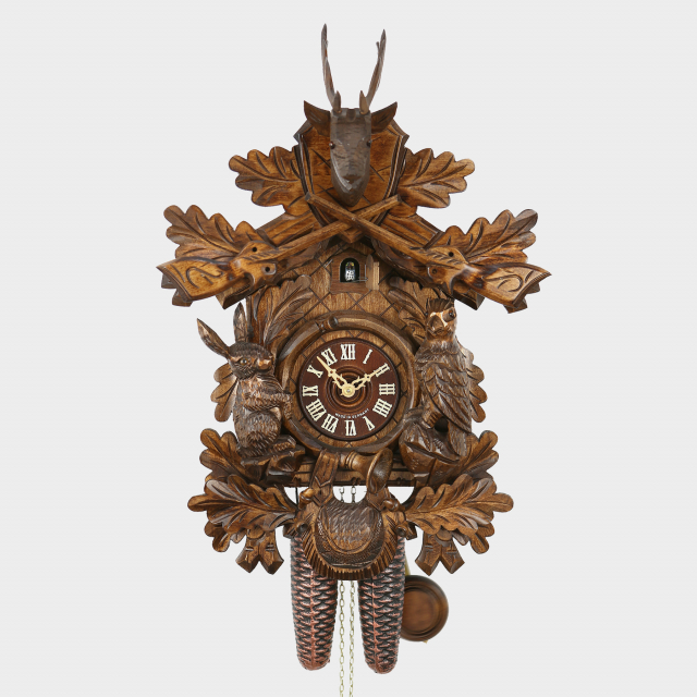 Diese original Schwarzwälder Kuckucksuhr wird die Damenwelt begeistern. Zwischen Eichenlaub, welches das Holzgehäuse umrankt, zeigen sich Wildhase und Fasan bester Gesundheit. Friedlich ruhen die Gewehre unter dem Hirschkopf. Der aus Holz gefertigte Kuckuck ruft zur vollen Stunde die Stundenanzahl (z.B. um 15.00 Uhr 3 Mal) und zur halben Stunde ein Mal. Diese Uhr verfügt über eine manuelle Schlagabschaltung. Zifferblatt, Ziffern und Zeiger bestehen ebenfalls aus Holz. Das mechanische Rechenschlagwerk läuft eine Woche. Hergestellt wird dieser Klassiker von der Firma August Schwer in Schönwald, einem inhabergeführten Familienbetrieb, der 1885 gegründet wurde.