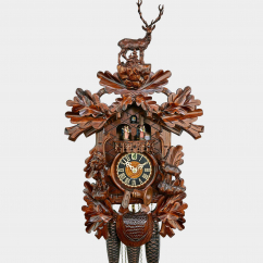 Der König des Waldes posiert auf dieser original Schwarzwälder Kuckucksuhr. Er steht auf einer mit Koniferen bewachsenen Lichtung. Der Steinbock auf seinem Felsvorsprung hat den Jäger noch nicht entdeckt, denn das Eichenlaub bietet guten Sichtschutz. Der aus Holz gefertigte Kuckuck ruft zur vollen Stunde die Stundenanzahl (z.B. um 15.00 Uhr 3 Mal) und zur halben Stunde ein Mal. Nach dem Kuckucksruf ertönt stündlich eine der beiden Melodien. Zur Musik beginnen die in Tracht gekleideten Paare auf dem Balkon zu tanzen. Dieses Modell verfügt über eine manuelle Nachtabschaltung. Zifferblatt, Ziffern und Zeiger bestehen ebenfalls aus Holz. Das mechanische Rechenschlagwerk läuft eine Woche. Hergestellt wird dieses Kunstwerk von der Firma Hönes in Titisee, die tief verwurzelt in die jahrhundertalte Tradition der Uhrmacherei ist und für Schwarzwälder Wertarbeit steht.