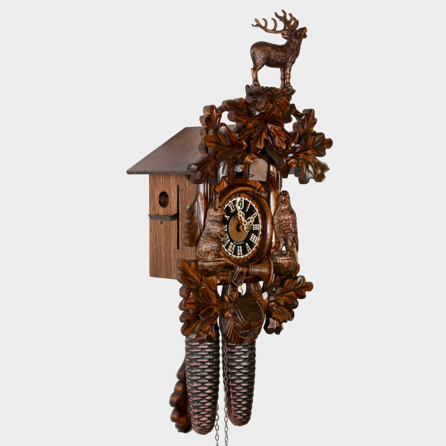 Ein traditionelles Jagdstück mit einem "Röhrenden Hirsch" zeigt diese original Schwarzwälder Kuckucksuhr. Das in Nußbaum gebeizte Holzgehäuse ist mit handgeschnitzten Eichenlaubblättern und Ranken verziert. Im klassischen Jagdmotiv - Stil ist das Zifferblatt umrandet mit einem Jagdhorn, seitlich befinden sich ein Hase und ein Vogel, eine Jagdtasche schließt das Gesamtbild ab . Der aus Holz gefertigte und bemalte Kuckuck ruft zur vollen Stunde die Stundenanzahl (z.B. um 15.00 Uhr 3 Mal) und zur halben Stunde ein Mal. Dieses Modell verfügt über eine manuelle Nachtabschaltung. Zifferblatt, Ziffern und Zeiger bestehen ebenfalls aus Holz. Das mechanische Rechenschlagwerk läuft eine Woche. Diese original aus Hand geschnitzte Schwarzwälder Kuckucksuhr wird im Originalkarton mit Gebrauchsanweisung ausgeliefert. Hergestellt wird dieses Jagdstück von der Firma Hönes in Titisee, die tief verwurzelt in die jahrhundertalte Tradition der Uhrmacherei ist und für Schwarzwälder Wertarbeit steht.
