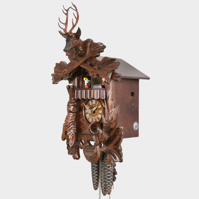 Ein Traditionelles Jagdstück zeigt diese Kuckucksuhr mit,