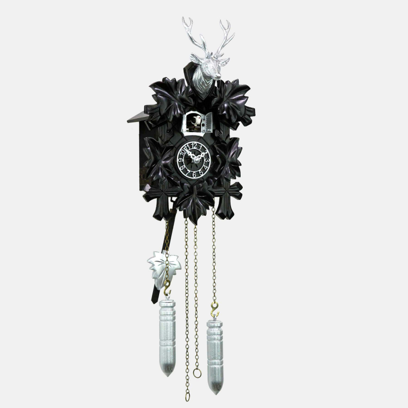 Diese Kuckucksuhr ist ein modernes und elegantes Jagdstück mit schwarz gebeiztem Gehäuse und einem Rahmen aus schwarzen Ahornblättern. Silberne Akzente setzen der Hirsch, die Kuckuckstür, das in arabischen Zahlen gehaltene Zifferblatt sowie Pendelscheibe und Holzgewichte.