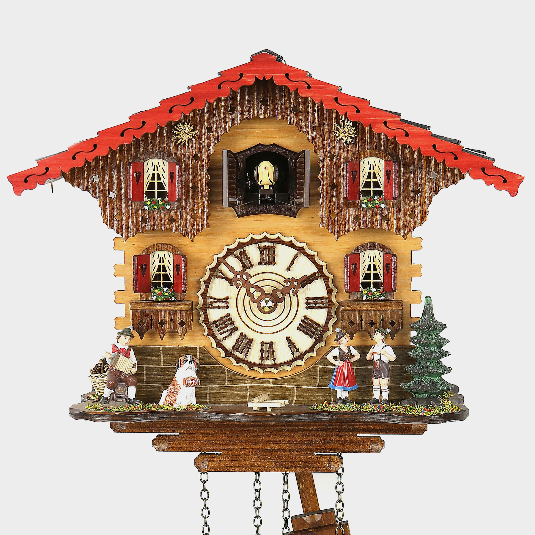 Ein Pärchen in Schwarzwälder Tracht und dazu ein Akkordeonspieler zeigt diese Schwarzwälder Kuckucksuhr in Chaletform. Das Holzgehäuse ist in hellem Nussbaum gebeizt mit geschindeltem Chalet Dach, Rundbogenfenster mit Herz-Fensterladen und kleinen Balkonen und einer aus Holz angedeuteter Mauer. Vor dem Haus zieren zusätzlich zu den Figuren eine Tanne, ein Weidenkorb und ein Bernhardiner. Der Kuckuck öffnet zur vollen Stunde die Tür, zwitschert und ruft die Stundenanzahl mit einem Echo. Danach ertönt eine der 12 verschiedenen Melodien. An der Seite befindet sich ein Schalter um die Musik separat oder zusammen mit dem Kuckuck abzustellen. Durch einen Lichtsensor ist bei Dunkelheit der Ton automatisch aus, die Uhrzeit jedoch läuft weiter. Diese Uhr wird mit einem Quarzwerk betrieben, das drei 1,5V Batterien Größe C benötigt (werden mitgeliefert). Die Kuckucksuhr wird im Originalkarton mit Gebrauchsanweisung ausgeliefert. Hergestellt wird diese Kuckucksuhr von der Firma Trenkle, einem seit einem halben Jahrhundert bestehenden Familienunternehmen in Simonswald, dessen Markenzeichen es ist, bewährte Handarbeit mit neuester Technik zu vereinen.