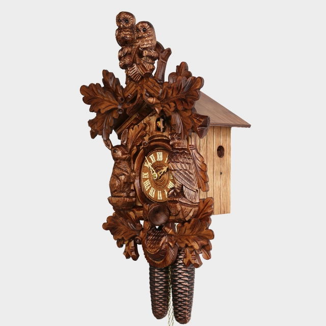 Waldtiere werden dargestellt auf dieser original Schwarzwälder Kuckucksuhr. Stolz sitzt das Eulenpaar auf den Tannenwipfeln, unter ihnen sitzt seitlich um das Jagdhorn je ein Hase und ein Greifvogel. Das massive Uhrengehäuse ist umrahmt von Eichenblätter und einer Jagdtasche. Eine Besonderheit ist die aus Holz dargestellte Tanne am Kuckuckstürle. Der aus Holz gefertigte Kuckuck ruft zur vollen Stunde die Stundenanzahl (z.B. um 15.00 Uhr 3 Mal) und zur halben Stunde ein Mal. Diese Uhr verfügt über eine manuelle Schlagabschaltung. Zifferblatt und Ziffern und Zeiger bestehen ebenfalls aus Holz. Das mechanische Rechenschlagwerk läuft eine Woche. Die Uhr wird im Originalkarton mit Gebrauchsanweisung ausgeliefert. Dieses Jagdstück wird von der Firma Gerhard Schwer in Schonach hergestellt, die seit 1900 eine Holzschnitzerei und seit 1972 in der 4. Generation eine Kuckucksuhrenfabrikation ist.
