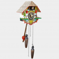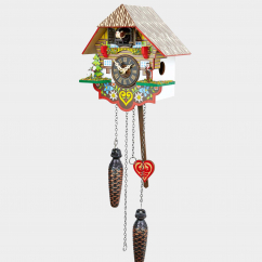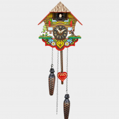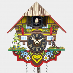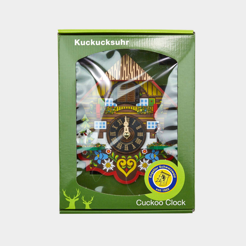 Ein buntes Schwarzwaldhäuschen das die Kinderaugen strahlen lässt. Das in weiss gestaltete Holzgehäuse ist mit bunten Blumen und Fenster bedruckt. Ein Hund und ein Alphornbläser warten voller Vorfreude auf den Kuckucksruf. Der Kuckuck öffnet zur vollen Stunde die Tür, zwitschert und ruft die Stundenanzahl mit einem Echo. Danach ertönt eine der 12 verschiedenen Melodien. An der Seite befindet sich ein Schalter um den Kuckuck manuell abzustellen. Durch einen Lichtsensor ist bei Dunkelheit der Ton automatisch aus, die Uhrzeit jedoch läuft weiter. Diese Uhr wird mit einem Quarzwerk betrieben, das zwei 1,5V Batterien Größe C benötigt. Diese Schwarzwalduhr wird von der Firma Engstler hergestellt, ein seit Generationen geführtes Familienunternehmen, welches für Tradition und Technik steht.